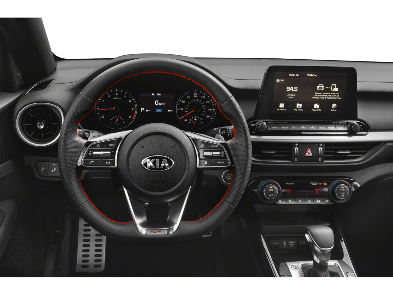 4-Wheel Disc Brakes, 8 Speakers, ABS brakes, Air Conditioning, Alloy wheels, AM/FM radio: SiriusXM, Apple CarPlay & Android Auto, Auto High-beam Headlights, Brake assist, Bumpers: body-color, Cloth & Leatherette Seat Trim, Delay-off headlights, Driver door bin, Driver vanity mirror, Dual front impact airbags, Dual front side impact airbags, Electronic Stability Control, Emergency communication system: UVO eServices, Exterior Parking Camera Rear, Four wheel independent suspension, Front anti-roll bar, Front Bucket Seats, Front Center Armrest, Front fog lights, Front reading lights, Front Sport Seats, Fully automatic headlights, Heated door mirrors, Illuminated entry, Lane Departure Warning System, Leather steering wheel, Low tire pressure warning, Occupant sensing airbag, Outside temperature display, Overhead airbag, Overhead console, Panic alarm, Passenger door bin, Passenger vanity mirror, Power door mirrors, Power moonroof, Power steering, Power windows, Radio data system, Radio: AM/FM/MP3 harman/kardon Premium Audio System, Rear anti-roll bar, Rear reading lights, Rear seat center armrest, Rear window defroster, Remote keyless entry, Security system, Speed control, Split folding rear seat, Spoiler, Sport steering wheel, Steering wheel mounted audio controls, Tachometer, Telescoping steering wheel, Tilt steering wheel, Traction control, Trip computer, Turn signal indicator mirrors, Variably intermittent wipers, and Wheels: 18 Machine Finish Alloy.